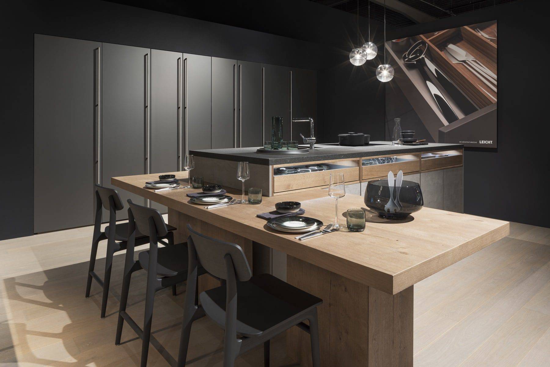 First up, and very notable is the use of dark kitchen tones, and specifically dark matt kitchens in moody greys or black. Muted dark tones have soared in popularity in recent years as homeowners are embracing the dark side to become bolder with their choices (or else more trusting of their designers!) Minimalist matt doors such as our ultra smooth black satin lacquer require no embellishment for a sophisticated look, but equally the layering of richly textured surfaces bring depth and character to a dark setting. You can achieve beautiful pairings of dark doors with natural elements such as wood, stone, ceramic and glass. Splashes of warm wood, marble, contrasting greys, taupe or warm metallic accents are all excellent choices for achieving a striking kitchen with welcoming appeal.